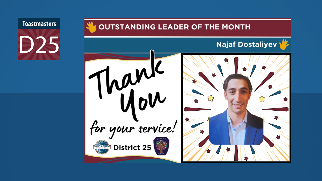 Congratulations to Najaf Dostaliyev for being the first Outstanding Leader of the Month. On behalf of the Trio, we want to give you a special thank you for being an amazing example of serving others and showing us all how it’s really all about growing together. Najaf’s commitment to our members and clubs, to his team, and to the district is an example of stepping up and having that YES I WILL attitude that we all appreciate.