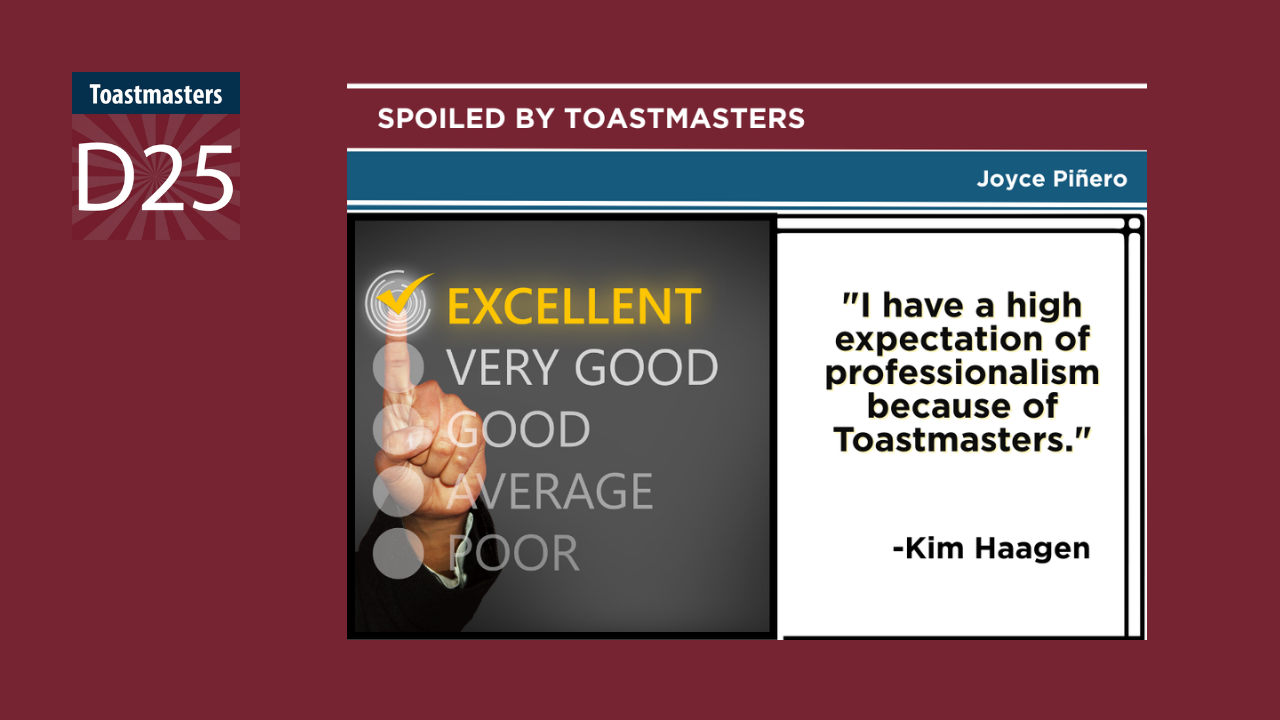 “I have a high expectation of professionalism because of Toastmasters.” Kim explains.