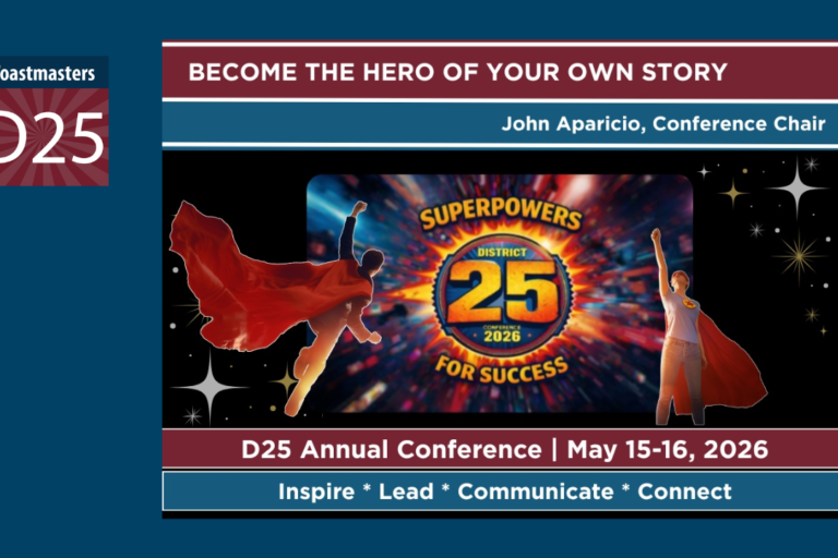 by John Aparicio Conference Chair What if everything you need to achieve your next breakthrough is already within you? This year, the District 25 Toastmasters Annual Conference invites you on an extraordinary journey with our bold and energizing theme: Superpowers for Success. This is more than a conference, it’s a transformation. A call to uncover…