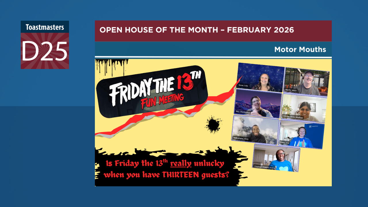 Some people consider Friday the 13th unlucky – but the members of Motor Mouths Toastmasters proved otherwise during their recent Open House, themed “Friday the 13th Fun!”