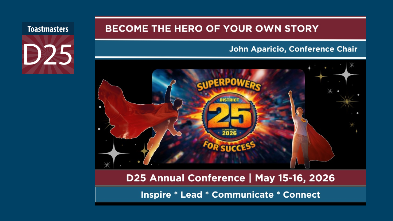 Join us at the District 25 Toastmasters Annual Conference and discover what happens when you stop waiting for your superpowers and start using them.