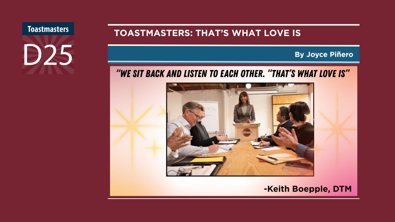 “Love describes our district.” Keith declares, “I know it’s an old-fashioned word, but we sit back and listen to each other. That’s what love is. We love each other. That’s Toastmasters!”