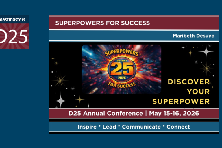 by Maribeth Desuyo DTM Conference Education Chair The countdown has begun! The D25 Toastmasters Annual Conference is just around the corner, and this year’s theme, “Superpowers for Success,” promises an inspiring and empowering experience for every member. Mark your calendars for May 15–16, 2026, and get ready to discover and unleash the superpowers within you…