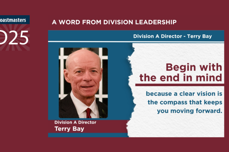 by Terry Bay DTM Division A Director In thinking about this year with Toastmasters, and especially my role as a Division Director, I am surprised at how fast this year has passed by. With a little more than two months left, I began to think about goals, and achievements, and if I had made an…